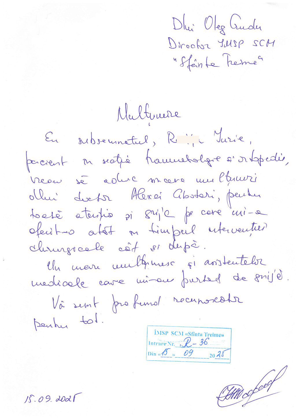 Pacientul Iurie R., într-o scrisoare adresată conducerii SCM ”Sfânta Treime”, exprimă cuvinte de recunoștință pentru echipa secției Ortopedie și Traumatologie, în mod special medicului ortoped-traumatolog, Alexei Cebotari.